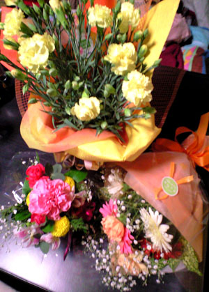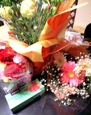 長女のプレゼントの花と次女の花束、そして、次女からの紅茶。私からのカーネーションの鉢植えです。