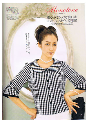 華やかでシックな装いは、モノトーンスタイルで完成!とキャッチコピーがついています。うちのお店に、このブラウスとお揃いのギンガムチェックのスカートもあります。