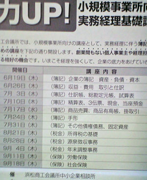 「底力UP!小規模事業所向けの実務経理基礎講座(初級編)」商工会議所中小企業相談所が主催する実務経理基礎講座を受講してきました。昨夜の睡眠不足もあり、へとへとで頭の回転数も通常より低く、困りましたが、初回は内容が簡単だったので、比較的楽に受講できました。今回、私は初めて体系的に簿記を受講することになります。日常業務として、経理を手伝うことはありましたが、体系的に理解していなかったので、どこか自信の無さがつきまとい、税理士事務所の担当の方との会話でも、もどかしさを感じることは多々ありました。それが、これで解決できるなら、私にとっては大きな進歩です。今夜から9月18日までの約2ヶ月、毎週木曜日はこの講座に参加します。楽しみです。今回のカリキュラムです。・・・・簿記のみでなく、税務から労働保険・社会保険まで、小規模事業所に必要な経理の内容は網羅されていると感じます。さすが商工会議所・・・・と思います。これだけの内容で12回の講座、24時間の講義があって5,000円本当にありがたいですね。