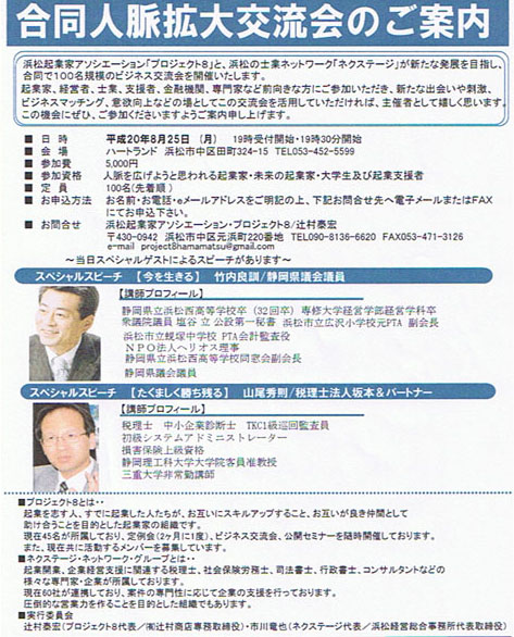 私たち「プロジェクト8」と「ネクステージ」(やる気あふれる士業の皆さんのグループです)が合同で8月25日に「合同人脈拡大交流会」を開催いたします。このイベントで、昨日紹介しましたTKC全国創業塾・経営革新委員会でも活躍されている山尾秀則先生のスピーチがお聞きできます。また、もう一人のスペシャルゲストは、代表の高校の同級生の竹内良訓様 静岡県議会議員です。・・・・・・・・・・・・・・・・・・・・・・・・・・・・・・・・・・・・・・◆8月25日「合同人脈拡大交流会」■スペシャルスピーチ 19:40~20:00テーマ「今を生きる」 ・竹内良訓/静岡県議会議員■スペシャルスピーチ 20:00~20:20テーマ「たくましく勝ち残る」 ・山尾秀則/税理士法人坂本&パートナー■主催 プロジェクト8(浜松起業家アソシエーション) ネクステージ(浜松士業ネットワーク)1.日時 平成20年8月25日(月)19時受付開始 19時30分~2.会場 ハートランド 静岡県浜松市中区田町324?15 Tel 053-452-55993.定員 100名 (先着順)4.参加費 5,000円5.参加資格 人脈を広げようと思われる起業家・未来の起業家・大学生及び起業支援者6.申し込み方法 お名前・お電話・電子メールアドレスを明記の上 下記お問合せ先へ電子メールまたはFAXにてお申し込み下さい。■お問合せ 浜松起業家アソシエーション「プロジェクト8」 e-mail project8hamamatsu@gmail.com