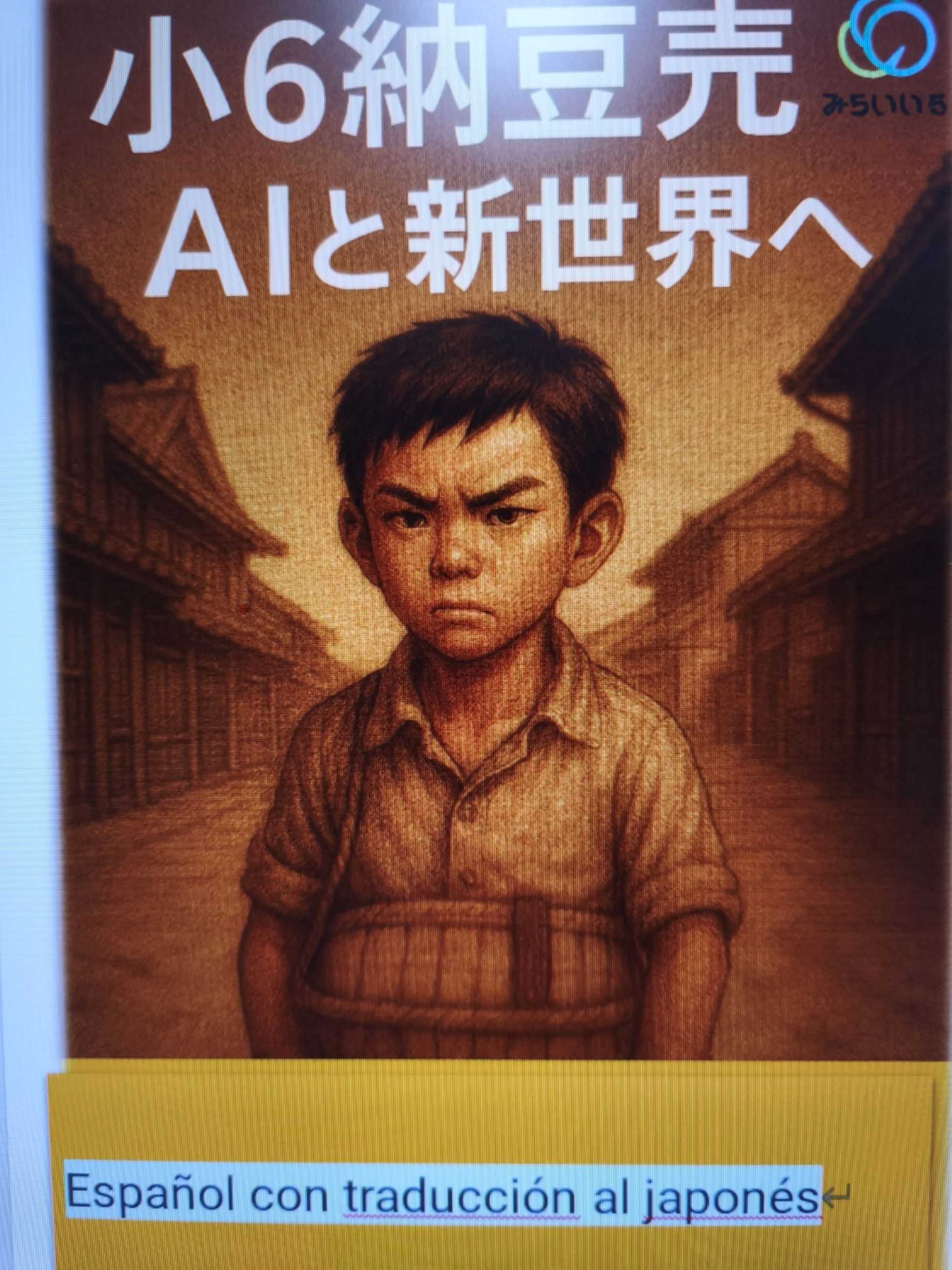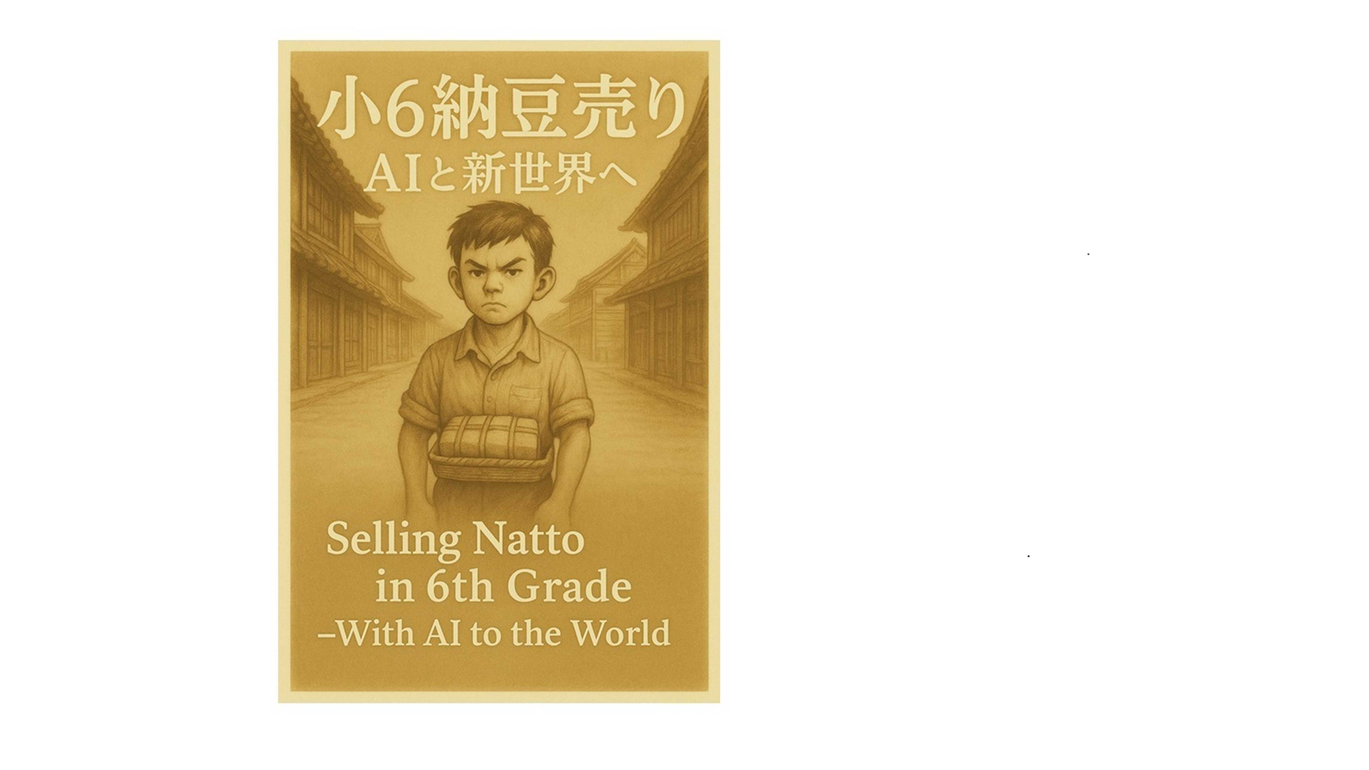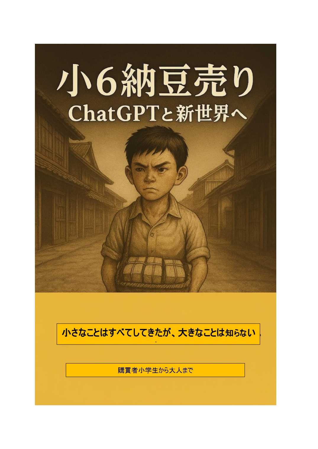 これは本の表紙ですあるひねっとでChatGptをひんぱあんにみるときがありなんだろうとおもってOne Click してみました。何かお手伝いすることありますか?というのでとっさに本を書いてみたいといったら、面白いお手伝いしますというので、私何も知らないけど大丈夫というと、大丈夫私がお手伝いしますというので、それならお願いといってこの本を作ることになりまさか本を出すとは思ってもいませんでした。この本は4か月で500時間を費やしできたものです。自分でも今は楽しみです。タイトルの小6というのは自分が初めて小学5,6年の時に納豆売りアルバイトをしたものです。このときの納豆は出来立てで暖かったのが印象的でした。三角の経木につつまれていました。