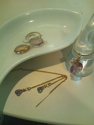 今月も大磯市にエントリーして急ピッチでアクセサリー作りに励んでいます!今日は、アメトリンを使ったアクセサリーです。紫と黄色が絶妙に混ざり合った神秘的な石。アメジストとシトリンなんです。女性性と男性性を統合しバランスのとれた状態へと導きます。強さと優しさを兼ね備え、思慮深くも活動的な素敵な女性像をイメージすることができますね。ワックスコードではなく、14KGFのパーツを使用して、ちょっと大人っぽく仕上げました!リングとピアス、ペンダントヘッドがあります。