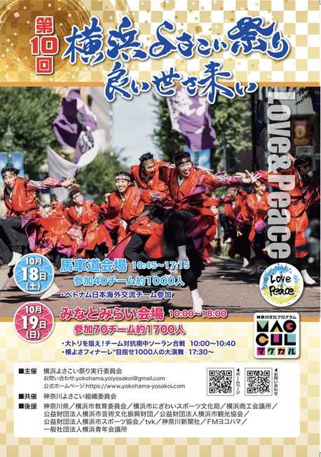 横浜よさこい祭り 良い世さ来い今朝起きると、小雨が降っているので、朝のお散歩は中止にした。先日(10/19)は、山下公園へ行った後、横浜よさこい祭り 良い世さ来いを見に行った。この日は、70のチームが、4つの会場を回りながら、よさこいの演舞を披露していた。最初に、山下公園から一番近い、象の鼻パーク波止場会場へ行ってみた。ここは10時からなので、10分前の9時50分頃に到着したが、既に一番前の席は埋まっていて、2番目になってしまった。10時になると、開会の挨拶が始まり、その後、14チームによる大トリを狙え!チーム対抗南中ソーラン合戦が始まった。A~Dブロックにそれぞれ3~4チームに分かれて競い、各ブロックで選ばれたチームが再度競って、最終的に大トリの演舞を踊る事ができるチームが選ばれる。会場にいる見学者の拍手と、3人の審査員によって、『成樂 seiraチーム』が選ばれた。今日の写真は、南中ソーラン合戦の写真を掲載してみた。横浜よさこい祭り 良い世さ来い 南中ソーラン合戦