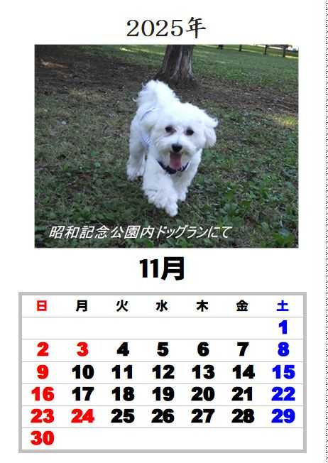 早いもので、今日から11月に入ってしまい、今年も残り2ヶ月になってしまった。歳のせいか、月・日の流れがとても早く感じる。懐かしいノエルの写真で、11月のカレンダーを作ってみた。今日は、神代植物公園へ行こうと思い、朝のお散歩は中止にした。