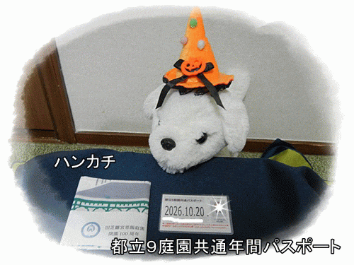 プレゼントのハンカチ&年間パスポート今朝も、透明ワンコのリッキー&ノエルと一緒に、朝のお散歩へ出かけた。万福寺へ行ってみると、イエローラブのランランちゃんと黒ラブのバビちゃんがいたので、沢山ナデナデしてあげた。その後、預かりボランティアさんが連れた、保護犬の陽ちゃんに会ったので、沢山ナデナデしてあげた。先日(10/21)は、旧芝離宮恩賜庭園へ行って来た。都立9庭園共通年間パスポートの有効期限が切れていたので、新しい年間パスポートを購入した。9つある都立庭園が1年間自由に出入り出来て、通常だと4、000円だが、シルバーだと2,000円で購入できる。写真を持って行って、ラミネート加工して貰った。この時期はプレゼントで、ハンカチを貰う事が出来た。旧芝離宮恩賜庭園では、この時期はお花はあまり咲いていなかったが、秋めいて来た日本庭園を一回りしてから、ここから歩いて行ける浜離宮恩賜庭園へ行ってみた。続く。旧芝離宮恩賜庭園
