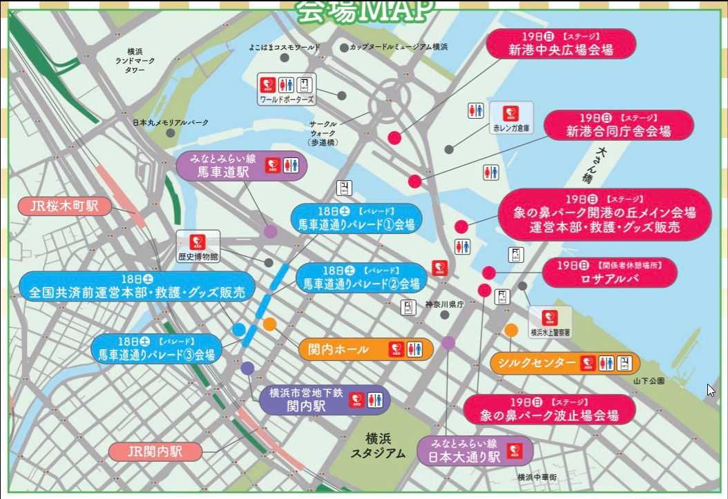 会場マップ※ 場所を変えて、土曜と日曜の2日間に渡って開催された。今朝起きると、小雨が降っているので、朝のお散歩は中止にした。今日の写真は、先日(10/19)、横浜よさこい祭り 良い世さ来いの象の鼻パーク開港の丘メイン会場で撮ってきた、各チームのよさこいの演舞の写真を掲載してみた。この会場の後ろには、飛鳥Ⅱが良く見えていた。その後、新港合同庁舎会場へ行ってみた。続く。象の鼻パーク開港の丘メイン会場