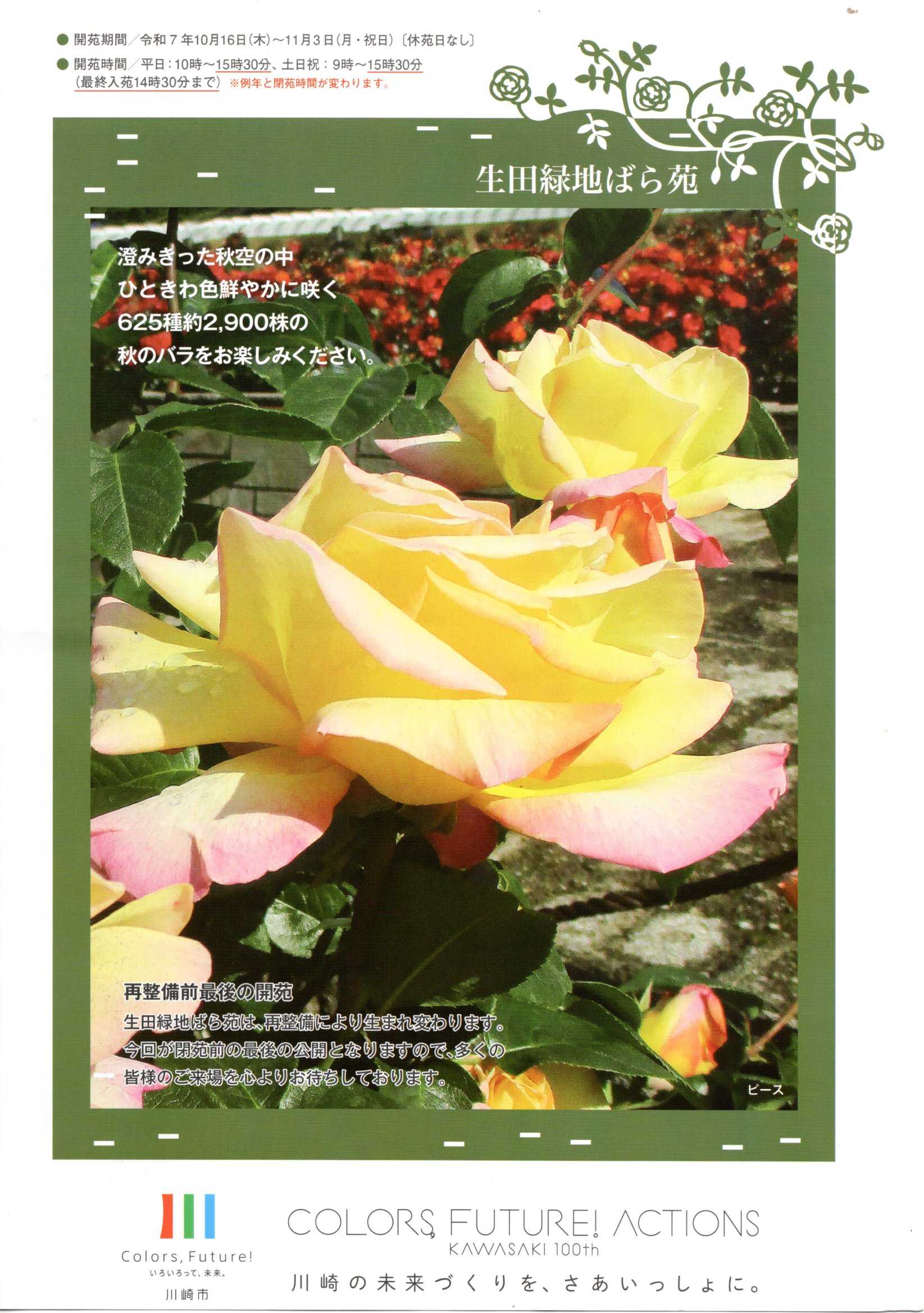 生田緑地ばら苑のパンフレット今朝も、透明ワンコのリッキー&ノエルと一緒に、朝のお散歩へ出かけた。最初に、小型ミックス犬(マルチーズ×トイプードル)のマルちゃんに会ったので、沢山ナデナデしてあげた。その後、テリア系ミックス犬のジョリちゃんに会ったので、沢山ナデナデしてあげた。万福寺の駐車場の近くで、白い柴犬の武蔵君に会ったので、沢山ナデナデしてあげた。万福寺には誰もいなかったが、帰りがけに、預かりボランティアさんが連れた、保護犬の陽ちゃんに会ったので、沢山ナデナデしてあげた。今日の写真は、先日(10/27)行って来た生田緑地ばら苑で撮ってきた、残りの写真を掲載した。行きはマイクロバスに乗せて貰ったが、帰りはマイクロバスが行ってしまったばかりだったので、歩いて階段と坂道を下りてきた。※ 生田緑地ばら苑は、大規模な再整備を予定している為、今回の開苑を最後 に、当面の間閉園し、2031年度のオープンを目指すとの事です。生田緑地ばら苑