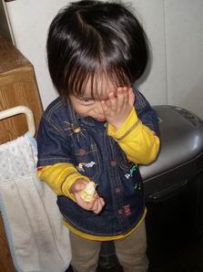 昨夜・・・我が実家では、ちょっとした騒ぎがありました。もちろん主役(!?)はRIKUです。昨日は、MYU-の面会は夜の時間帯に行ってきました。20時から21時まで。日曜日ってこともあって、じぃじも一緒に4人で行きました。まぁ・・・いつもと同じように面会し、帰宅。昨日は、じぃじがRIKUのお風呂を入れてくれるというのでお願いした。楽しそうにお風呂に入って、出た後もご機嫌でパジャマにお着替え・・・ここまではいつもと変わりなくでした。そして日課である、寝る前のミルク・・・ママは搾乳していたのでばぁばにミルクを作ってもらっていた。すると・・・・キッチンの方から『ガシャーン!!ドンっ!!バコっ!!』Σ(; ゚Д゚)すごく派手な音がしましたけど・・・???振り向くと・・・ RIKUがいない・・・そうです。。食卓のイスの上に乗って遊んでいたRIKUが、イスから転落!!ビエエェェ。゚(。ノωヽ。)゚。ェェエエン!!!RIKUは、ビックリしたのと痛いのとで大泣き!!何が起こったかわからなかったが・・・RIKUのオデコが大変なことになっていた。よくオデコは怪我しているけど、今回は本気で焦った!!大きいコブができている。いつも、怪我の写真なんかもUPしたりしていたけど・・・今回は、さすがにお見せできるような怪我じゃない。ママは最初見たとき、寒気がした(;;゜д゜)ザワァァァ本当に今回のは、いつものコブより酷い!!ありえないくらいボコって腫れて内出血している。打った直後なんて、血管が浮き出てとんでもないことになっていた。頭は毛細血管が多いのでちょっとしたキズでもけっこう出血したりするが・・・でも、流血せずに内出血だけってのがすごく不安。ミルクが出来上がっていたので、まずはミルクを飲ませ一応泣き止んだ。ばぁばとじぃじも近くにいたけど、みんなで大騒ぎ。『これ、やばくない??病院連れて行ったほうがいいんじゃない??』っと、ばぁば。『救急車呼ぶか??』っと、じぃじ。『救急車はさすがに、大騒動になるし・・・日曜だから救急の当番医が新聞に載っているがず・・・電話してみようか・・・』っと、ママ。3人でオドオド・・・ヽ(д`ヽ)。。オロオロ。。(ノ´д)ノ養護教諭をしていたママ、こんなキズはしょっちゅう見ていたはずなのに・・・やっぱり仕事じゃなく、しかも我が子となると冷静ではいられなくなる^^;かなりの役立たずぶりを発揮してました(汗)。とりあえず、救急当番医に電話をしてみた。事情を説明して、病院に連れて行ったほうが良いか聞いた。看護師さんは、『腫れている時は、そんなに心配はいらないと思います。食べたものを吐いたり、寝る時間じゃないのにすごく寝ていたり、グッタリしていたら心配なので連れてきてもらいたいですが・・・』っと。ミルクを吐いてはいないし、寝る時間なので寝て当たり前・・・グッタリはしていない。でも、ミルクを飲んだあと顔が蒼白になったのでちょっと心配。。。迷ったあげく、やっぱり病院に連れて行くことにまたまた4人で救急病院へ。最初・・・看護師さんにキズを診てもらい。『かなり腫れてますね・・・でも、腫れている方が大丈夫なんですよ。』っと。『小さいのでCTを撮るとしたら無理矢理になっちゃうし・・・、とりあえず先生と相談してレントゲンをどうするか決めましょう。』っとのことだった。そして、いざ診察室へ。RIKUは、もちろん泣く!!先生は・・・『すごい腫れてるねぇ。どんな落ち方したの??』っと、ちょっぴり苦笑。『大丈夫そうだけど・・・念のためにレントゲンだけ撮ってみようか。』っということでレントゲン撮影。もちろんRIKUは大暴れ!!じぃじとママとで必死に押さえ、撮りました。結果・・・骨には異常なし。良かった~一安心。脳は、やっぱりCTを撮らないとわからないらしいけど先生が様子を見るかぎりでは大丈夫そうだと・・・注意書きの用紙をもらい、『帰宅してその用紙に書いてあるような症状が出てきたらすぐ病院に連れてきてください。』とのことでした。無事、帰宅したRIKUは眠かったせいかちょっと機嫌は悪かったけど歯磨きもして、無事就寝。あいかわらずオデコは酷いことになっている。このキズ・・・今までで一番酷い気がするけど・・・治るのだろうか??それにしても、人騒がせなRIKU・・・やっぱり男の子だからか・・・今まで何度、救急病院に行ったことか・・・2歳でこんだけ救急病院に行っているなんて・・・これから先が思いやられる。今は、とりあえず落ち着いて寝ているし、なんともなければいいけど・・・先生には『明日はもっと顔のキズは酷くなっていると思いますが、キズは治るから心配ないですよ。』と言われましたが・・・あれ以上酷くなるって・・・どうなの??昨日はすでにお岩さん(!?)みたいな状態ですよ・・・(←お岩さんって有名じゃないかな?? お化けみたい??笑)RIKUの今日起きてきた時の顔がどうなっているのか・・・かなり不安なママですil||li(-ω-;il||liガーン…もう寿命が縮まる思いはしたくないママで