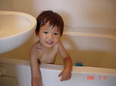 しかし、この暑さ、どうにかならんかね。cool bizのブーム??(地球温暖化を考えて)と節約、健康を考える事を兼ねて我が家はパパが居ない時はクーラーは付けず、扇風機で過ごしてます。幸いにも風があったりすると意外に涼しい。でも、隼人は外に出かけたい…って事でまた9時半から散歩へ。水を使ってあそんで11時まで帰ってくれず(トホホ・・・)買い物の帰りは自転車の前かごにあたりそうな位揺れてた(笑)。 で、午後・・・朝でも隼人は汗ビショビショ。そんなのを連れてウロウロしたら熱射病になるし、私も倒れたくない…ってことで本日の暑さ対策&隼人のストレス発散目的で水浴びをさせてあげる事に。でもうちはプールを置くようなスペースもないしベランダの水はけも悪くてお風呂プールにしました(≧v≦)楽しそうでしょ??また一段と成長したように思う。叫ぶ声も大きくてそれが甲高すぎてヤなんやけどね。この日一番の良い顔??ザバ~っと△やっちゃった。焦ってるプププ。浴槽から出れるかも??→