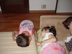 今日は社宅関係のお友達(ママ友を含め)たちでたこ焼きパーティをしたのだ☆d(o^v^o)b 子供たちは楽しげに遊びママ達は楽しくおしゃべり。隼人と陸pなんてこんな風に仲良ししちゃたりして。実は←これ隼人が『耳・・・ミミ…』って耳掃除を要求しながら陸pの膝にのっかったらしい。(何で陸p??) そうそう、私、最近物忘れ…とまではいかんけど『アレ…なんやったっけ?』みたいなことが続いてたんで脳を鍛えるトレーニングの本を買ってついでにみんなでチャレンジしてみた。みんな結構テンション上がって盛り上がった!!! 超楽しくおいしくたこ焼きを食べた後は語りつくし、遊びつくし、結局隼人は今日は9時就寝。いい一日だった~@^▽^@