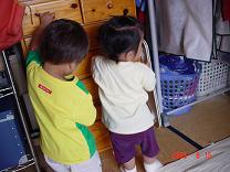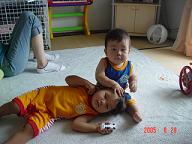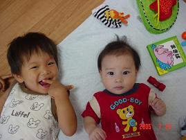 この前実家に帰った時に母にアンパンマンのワッペンでマスコット??みたいなのを作ってもらい、それを便座につけてあげたらそれを見つけたはやとが『ウンウン(うんちのこと)』と言い出し、トイレに行ったら、・・・・・・・・・・・・・なんとっ!!してるじゃないですか!!おしっこを☆拍手☆とうとうトイレで出来ちゃった!!ワーイ!!やっぱりトイレに行きたいと思わせる事が重要なんだな~と思う。待ってよかった。まぁこれからも一進一退でしょうが・・・・・。 そして今日、散歩に行けない隼人との2人きりにイライラしてきたんで陸pとママ友を招いて遊んでました。お揃いの(一緒に買いに行ったのだ)服を着て楽しそうな隼人と陸p、なんか和むな♪隼人はヤンチャ満開で、陸ちゃんは発展途上って感じかな。癒されちゃった。フフフ。