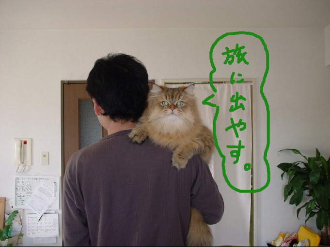はい。ようやく萌ゾー復活の兆しでございます。どうやら今年の夏カゼは熱だけ長く続くらしく・・・さすがの萌ゾーも熱には勝てず日に日にやせ衰えていきました。で、熱がさがった頃に喉の奥にドでかい口内炎ができてしまったらしく不気味なくらい静かな萌ゾーがそこにはいます。とりあえず絶叫まじりの歌声がなつかしい今日この頃・・力也は・・・ 大好きなとぉちゃんと旅に出るらしいです。想像するに・・・チンチラを肩に乗せたオヤジって、大注目間違いなしなんだろうなぁ・・・