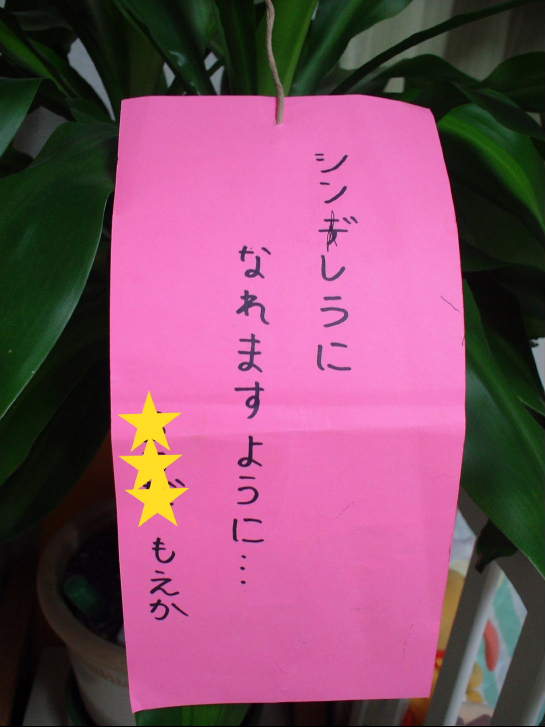 そんなわけで、あんな強烈な痛みを味わったんだから出産と合わせて一生分の痛みを使い果たしたと信じて疑わないrikibooです。で、歯ですが、抗生物質が頑張って効いてくれたみたいで神経も抜歯も免れ悪運強しのrikiboo様です。この前は萌ゾー同伴で歯医者行ってきましたその間、萌ゾーは初めての異様な空間のなか、地蔵のように気配を消すのでした。 (おとなしく待っててくれたってこと)そしてその帰り道・・・横断歩道を渡り中、ふと横を見ると頭から湯気だして怒っている彼女がいます。 萌ゾー:「もう ソックリ」・・・?ソックリ?何が? 萌ゾー:「「なんでなんでソックリなのよぉ」・・・意味がわからない・・・彼女はいったい何に腹を立てているのか・・・恐る恐る聞いてみた。。rikiboo:「なに?どうしたの?」 萌ゾー:「もうなんでよぉぉぉソックリ」彼女の怒りが治まる気配はない。rikiboo:「何がよ」 萌ゾー:「だってソックリソックリ出るのぉぉ」 出る?・・・(-_-)怒りの彼女にそっと耳打ちしてみた。rikiboo:「萌、・・・それ、・・・シャックリ」(どうやら自分の意志に反してシャックリが出るのが許せなかったらしい・・・) 萌ゾー:「シャックリ?なにがぁ?」(この女、まだわかってない(-_-)rikiboo:「だ~か~ら~、ソックリじゃなくてシャックリって言うの」(それにしてもよくそんな自信満々に間違えられたもんだ・・ しかもイントネーションまでしっかりソックリになってるし・・) 萌ゾー:「ねぇねぇ、なんでシャックリでるのぉ~?」rikiboo:「横隔膜の痙攣」 萌ゾー:「おおまぐめの目?」 (-_-)rikiboo:「・・・なんでもない」あぁ、早く萌ゾーと普通の会話がしてみたい七夕の短冊に先生代筆でこのように書かれておりました。rikibooは母として全力でこの願い事に協力する所存であります。 ・・・まずは改名?
