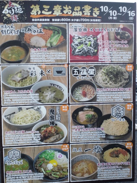 ファツゥです。今日から、大つけ麺博も第3章です。こんな感じです。美味しそうだなと感じたのは、北松戸のおとど「肉玉つけ麺」をおとど盛にしてもらいました。つけ汁がすき焼きのたれに魚粉を混ぜたような感じです。肉は美味しかったです。つけ汁に温玉がありますが、それとは別に生卵がついています。麺の所にあったので、つけ汁に入れるのに一苦労。入れると味がまろやかになり、美味しかったです。次に並んだのは、神田鬼金棒(きかんぼう)です。「シビカラつけ麺」を肉増しにしました。唐辛子の辛さと四川山椒のシビレる感覚を混ぜたつけ汁です。肉はつけ汁の中にも入っていますが、麺のところでもつけてもらいました。ブロックチャーシューでした。つけ汁の中に他にもやしとネギとヤングコーンが入っていました。- 以上 -