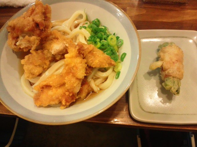 ふぁつぅです。仕事が遅くなったので、晩御飯は五反田おにやんまにしました。讃岐うどんの店です。食券を買って店内へ。冷並とり天うどんと週替わり天ぷら2種から、アスパラベーコン天を頼みました。そばはないです。店内はテーブルの上に天かすの缶がいくつか置いています。冷並とり天うどんはこんな感じです。関西風の薄だしのうどんです。美味しかったです。