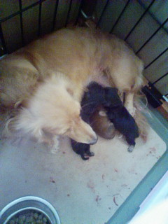 ミルクを買って来てからもう一度サークルに入れてサクラを無理やり横にすると子犬達がおっぱいに吸い付きました。