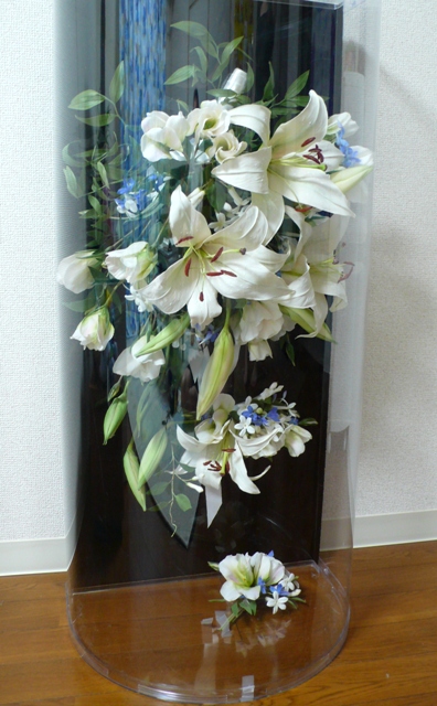 暑中お見舞い申し上げます。毎日暑い日が続きますね。夕方になると急に空模様が怪しくなり雷や雨が・・・。知人より結婚のために作って欲しいとオーダーのあったブライダルブーケやっと出来上がりました。真っ白い裾の長いドレスに合わせて作ったメインのお花は芳香の良い「カサブランカ」という百合です。大きなブーケはカサブランカやトルコ桔梗、ブルーの小花をちらして全体にクレッセント形にまとめ上げ、中間にとめてあるのは髪飾り、下にあるのは花婿がつけるブートニアです。素材は真っ白い布を生のお花に近い色を染料で調合して筆を使って染色します。花弁はワイヤーが見えないようにすべて2枚重ねに張り合わせコテを使いながら立体感と質感を出していきます。お花によって使う布地も様々です。何と言ってもまとめるのが一番大変です。このブーケが、ウェディング当日花嫁さんと花婿さんの演出に役立てば嬉しいなぁ~