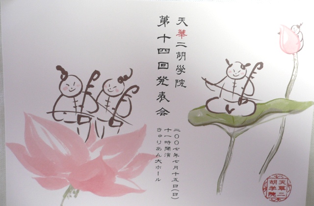 「賈鵬芳&天華アンサンブル」のコンサートに行ってきました。いつも二胡のコンサート中心に出かけていましたが今回は二胡・古箏・中胡・高胡・低胡パーカッション・揚琴・笛子・笙・琵琶・三弦・にベース・チェロと、どの楽器もプロとして活躍中のメンバーで構成された豪華版のアンサンブルで2年ぶり開催とのことで、とても楽しみにしていたコンサートでした。全員合奏でスタートし各楽器の達人たちをメインにした演奏が次々と繰り広げられあっという間の2時間、中でも印象に残ったのは馴染みのメロディーの「白毛女」。各自パート中心のソロも素晴らしかったですが、やはり全員合奏は迫力があってどっぷりと中国音楽に浸らせていただき感激しました。女性演奏者のチャイナ&お顔の美しいこと日本人が着ているのとは違いやはり本場もんというころでしょうか洗練された着こなしとドレスの美しさが際立っていました。コンサート終了後先生方がロビーに登場され記念撮影大会?となりそれもまた、楽しいひとときの時間です。今回、初出場の 甘 建民さんと面識があったのでご挨拶をしながら記念撮影させて頂きネットでも品切れ状態の周先生の二胡作品集を衝動買いしてしまい(作品集はプロのお方も使用しています)中身の濃厚さに「ありゃえらいもん買ってしまったとても弾けへん~~~~~~~」まっ、コンサート記念ということで大切にしまっとくだけじぁ意味ないかぁ。