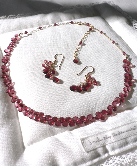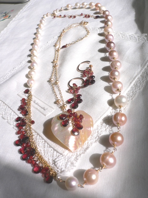 この1ヶ月近くガーネットシリーズを作っていました。デザインから始まって買い付け、石の選定、デザインをもとにしていくつかサンプルを試行錯誤しながら仕上げて全体のバランスをみながら最終的に仕上げ。毎回、同じ工程となるけれど、デザインが同じでも使うGemstone(天然石)によって感じや雰囲気が違ってきます。今回、使用しているロングネックレスのパールは大きい粒で11ミリもあります。ハート型の白蝶貝にガーネットのフリンジをつけたものをこのパールと2連につけても可愛いいですよ。半日近く座りっぱなしなので、もう超運動不足になってしまうと言うことは下半身も大きく?なって足もむくんで大変、大変。今は、桜も満開なのでお花見がてら近所に散歩でも、とにかく歩かなくてはと思っていはいますが・・。合間に二胡の練習を入れると1日はあっという間に終わってしまいます来週は3月分の振り替えもあるので週2回、レッスンあります。そろそろ、初夏ものを作り始めないと~