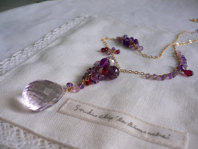 行ってきました~年二回東京と神戸で開催される展示会。なかなか時間がとれなくて最終日にすべりこみでした。宝飾業界のバイヤー専門の展示会なので一般の人は入場できないんです。世界35カ国、1650社が出展するので まぁ、会場の中は国際色と熱気でムンムン~クロークにコートを預けたものの会場のなかは暑い暑いっ(汗)初日は「日本ジュエリーベストドレッサー賞」の表彰式のパーティーがあり(もちろん別料金ですが)今年は10代~長澤まさみ・20代~倖田來未・30代~篠原涼子・40代~YOU・50代~阿川佐知子・60代~岩下志麻 男性は今年は速水もこみち☆以上の方々が出席して各社が彼らのイメージしたジュエリーを贈呈するというパーティーです。画像のお二人はいつも私がお世話になっているGインターナショナルの日本へ来て18年というご夫婦です。インドの天然石はカットも素晴らしくとても綺麗で格安な掘り出し物もあり、ちょっと無理をお願いしてジャイブールから欲しいものを取り寄せていただいたりしてます。お子さんはまだ、小さくてインドインターナショナルスクールに通学していて、とっても可愛い子供たちです。そして梅干のおにぎりや、マグロのお寿司が大好物だと言うのです。さてさて今回アップしたネックレスはこちらの方で買い付けた25キャラットの超デカ・アメジストをネックレスに仕上げました。優しいパープルのグラデーションと存在感のあるものを意識して作ってみました。 さて、今週土曜日は、また二胡のレッスンです。(楽しみだけど緊張の80分)先生は誰かな~~さぁ!練習開始だ!