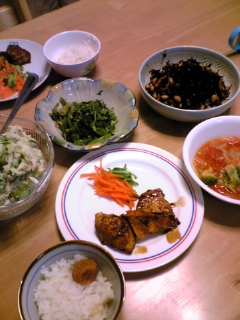 かじきのニンニク醤油焼とポテトサラダ。ほうれん草のおひたし。ひじきと大豆煮。トマトスープ