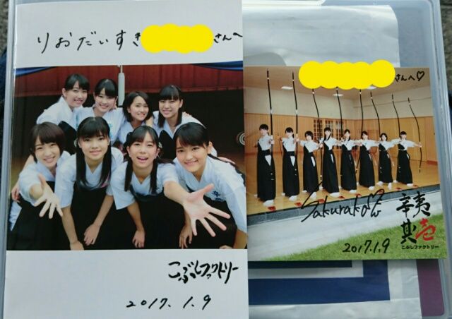 \> ゜ゥ゜リっ ロング握手会ですよ~♪ こぶしファクトリー 1stアルバム『辛夷其ノ壱』発売記念 ・個別ジャケットサイン会 ・個別握手会 あっと六本木 2泊明けで現地入り、昨日夕方のひと騒ぎでヘトヘトだったから、ドリンク剤の力を借りて翼を授けて… サイン会 2部…藤井×2、広瀬、野村、小川、浜浦、田口、和田、井上×2 →前回イベントを踏まえて、急きょ全員分を追加してブックレット1冊に全員のサインをまとめて…宛名なしサインのみのメンバーは短いながらもお話を色々と。 まずは梨央のところにご挨拶して、続いて井上さんところに行って先に発注分のそれぞれのソロを書き書きしてもらう。 早々に梨央から色々と突っ込みを…(  ̄▽ ̄) それから梨央からの年齢順(途中、浜浦さん混雑のため後回し)でサインを頂戴に…。 誕生日から4日過ぎましたが梨央にアピールを兼ねて、幾つに見える~♪と聞いたら10個も上に…(汗)年男というかなりなヒントをあげて。 \> ゜ゥ゜リっ へぇ~!10個も上に言っちゃったね~(ニヤリ) とニヤニヤ顔を見せつけられる。 それから全員のところを回りましたが、スーツ着て来たもんだから。 いつもと違った雰囲気ですね… とか、 もう「しんちゃん」は着ないんですか? とかあらぬ方向に( ̄▽ ̄;) 途中、よくよくブックレットを見てみたら梨央から2回目にもらったサイン(全員に貰うヤツ)の日付が2016年と1年違いでww 狸;´Д`)ノ あらまあ~! とは言え、なかなかイイものを頂戴しまして、ちょいとお昼休みして… 握手会 1部…藤井 →まずはサイン会の間違いの突っ込みを…まだ2017年が始まったばっかりだからね~!とフォローしつつも…。 \> ゜ゥ゜リっ やっちまった~(汗) 2部…藤井×2 →大学進学のお話と、最近のブログ画像のお気に入りのお話を。両立は大変かもしれないけど応援してますよ~!と。文系の学部のようで、ちょっとしたアドバイスもo(^o^)o 最近の梨央ブログでのお気には上目遣いのソロショットですが、握手会でニヤニヤ見つめ合ってる時の表情が一番至福の時かも! 3部…藤井 →ラストは3/4について…何とか行けそうだから楽しみにしてますと!こぶしの単独ライブではしゃぎたい!と思いを伝える。 \> ゜ゥ゜リっ ドンマイ! エールをもらって、充実のニヤニヤなニギニギをして〆。 サイン会を重点にしたため握手は少なくなりましたが、その中でも十分に充実できたのかなと。 今日も楽しい時間をありがとう! \> ゜ゥ゜リっ ~♪ また、お仕事頑張りましょう!