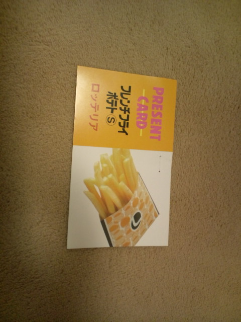 こんにちは!!今日久しぶりにロッテリアに行きました。すると・・アンケートに答えたらもらえました。やったぁ。ポテトあんまり好きではないけど、やったぁ!以上。