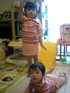 今日は本当なら、みいちゃんのヤマハ音楽教室のはずでしたしかし、今朝、右肩の痛みで目が覚めたロキロビ・・・腕が上がらない!!今日はいいお天気、洗濯もしたいし、焦りました20代の半ばに、関節の痛みが頻繁に起きて、何件か病院に行ったのですが、なかなか原因がわからなくて・・・最終的にはリウマチと言われました。ただ、軽度のもので薬の服用ですぐに治る程度のものと・・・その時に、完治したのですが、疲れたりすると関節に痛みが出ることが・・・昨日のお墓参り、長距離運転で疲れたのかなぁ?腕をだましながら、洗濯だけはこなしたのですが痛みがピークに・・・みいちゃんにはかわいそうでしたが、ゆうくんを抱いての音楽教室はどうにも無理そうなのでお休みする事に・・・家の中での1日になってしまいましたが、みいちゃんはご機嫌で遊んでくれましたしかも、腕の痛い私の為に、ゆうくんのおむつを取って来てくれたり、ママの肩にちちんぷいをしてくれたり・・・ありがとう、みいちゃん 顔クシャスマイル♪ ゆうくんもご機嫌です♪このTシャツはママの作ったTシャツですRRさんの肩開きTシャツのパターンで作った物です初めてなので試しに作ってみようくらいだったのですが、失敗作です前から後ろにスナップを留めるはずなのに、できあがったら反対でしたでも、着るのに問題ないので着せちゃってます80サイズでパンパンなので、次は90で作ろうかなと思ってます最近、ゆうくんはハイハイもボチボチなのにたっちをしたがります。抱っこの姿勢で足を突っ張って立っては大喜びお膳なんかに寄りかかると何とか立ってます順番、逆じゃない 今日もとっても仲良し♪夜くらいになってから、肩はずいぶんラクになってきて助かりましたでも、一番はみいちゃんの協力です明日からの3連休、みいちゃんの楽しい3日間にしたいと思います