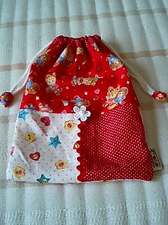 今日、2回目の日記です今日は幼稚園のクラブの日お天気がよければ水遊びの予定でしたが、天気は微妙・・・雨の場合はのりとハサミとクレヨンを持ってくるようにという指示だったので、両方の準備をしていましたのりとハサミは幼稚園でくれたものなのですが、ママのバックに入れておくと見つけにくいしクレヨンはこぼれちゃったりするので、お道具袋を作ろうと昨日の夜になって突然、思いついちゃいましたサッカーも観たかったし、子供たちが寝たのでダイニングにミシンを持ってこれるのでパパッと作ってしまおうと取り掛かりました ちょっと楽しみたくて、下部分は白っぽい生地と赤の水玉にしてみました絞り口の部分も赤の水玉です家にあるものを使ったので、紐が白しかなかったので玉の部分を生地でくるんでみました波型テープ?を縫い付けてアクセントにして、端をかくすのにレースのお花をつけてみました上履き袋のときと同じタグがあったので付けましたブーケさんのおまけタグですクレヨンとハサミとのりがちょうど入りました製作時間は1時間ちょい、布も適当にカットしてロックミシンをダダーッとかけて、縫い代を倒したところを直線ミシンで押さえましたみいちゃんはとっても喜んで、幼稚園まで自分で持って行きました小さい物だけど、久々のミシンとっても楽しかったです