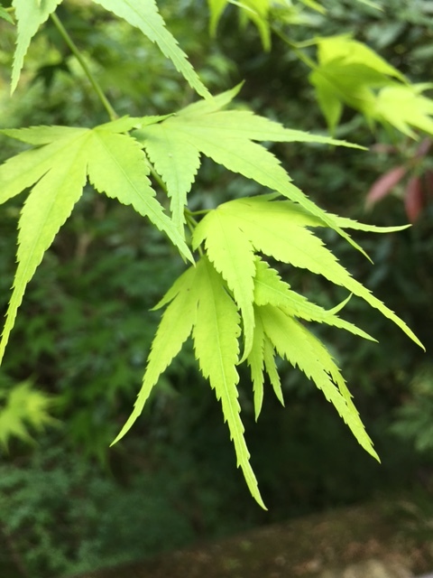 ここでも一面の新緑のもみじがきれいに光っていました。秋には真っ赤に染まるのでしょうね。