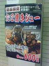 寒いぞ、大阪(笑)。昨日の夜、大阪にやってきた。新幹線の新大阪駅のホームに降り立った瞬間、あまりの寒さに声をあげそうになった。電車の窓から見えた広告塔の気温表示を見たら2度!どおりで寒いはず、えらい時に来てしもた(苦笑)。新大阪で見つけた広告。見た目はたこ焼き、中身はシューのたこ焼きシューらしい。既に閉店してるのでわからないが売れてるんやろか。ご当地シューという事は全国各地で色々あるんだろうか。博多の明太子シューとか、いかにもありそうだ(笑)。見た目と味のギャップ、食べてみたい気もするが(笑)。