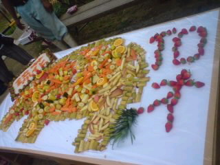 そして、しばらくすると、バースデーケーキ作りが始まりました。小さめに切ったエサを象の形に並べていって、あっという間に完成!