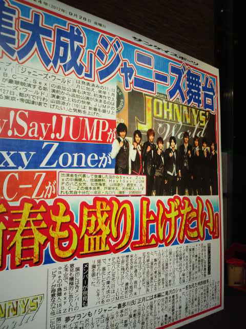 ジャニワ 帝劇内 初期大ポスターWEB記事追加分 1月28日(月)17時「ジャニーズ・ワールド」再演決定!山田涼介「ジャニーさん指名ならぜひ」 [ 2013年1月28日 11:46 ]sponichiプロデューサー役の薮宏太「ジャニーさんは僕の役みたいに怖くない」[ 2013年1月27日 17:14 ]sponichiジャニーズ・ワールド再演決定!外国人シート増やす[2013/1/28-06:03 スポーツ報知]ジャニーズ・ワールド再演!海外の反響大[2013年1月28日7時29分 紙面から]ニッカンジャニー氏がテレビ初出演[2013年1月28日6時24分]ニッカン「ジャニーズ・ワールド」早くも再演決定 Hey!Say!JUMP主演舞台2013年1月28日 紙面から 中日スポーツジャニーズ事務所のアイドルグループHey!Say!JUMPが主演する舞台「ジャニーズ・ワールド」が27日、東京・丸の内の帝国劇場で千秋楽を迎え、今年12月~来年1月の2カ月にわたって再演されることが発表された。昨年11月に開幕した本作は、初演ながら全103公演が即日完売し、約19万人を動員する大ヒットとなった。作・構成・演出を手掛けるジャニー喜多川社長(81)のギネス世界記録認定記念ということで、22カ国から計3226人の外国人観客が来場。世界的な注目を集めたこともあり、製作の東宝が再演をオファーした。