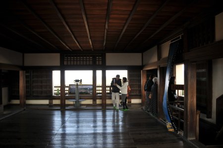 とても急な階段。天守は3層になっていて、外を眺望できる天守も数カ所あり、複雑な構造になっている。