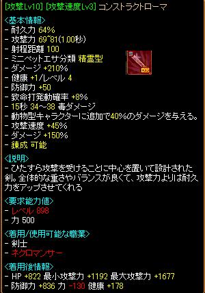 おはこんばんちゃ~(´゜Д゜`)久々にブログ更新しようと思ったらパス忘れてログイン出来なかったとかじゃないですよ!実はですねー剣士君2次転生しましたお!707で我慢できずにww目隠しのいやがらせされたり・・翼が生えそうな気が・・・しないですね!2次まで約2カ月でした 遅い気がするのは自分だけ?wちょい前の異次元でこんなの出来ました!実は速度スキルラズベリ完成まで4回混ぜましたwww1回目 速度スキル素材盾ないから単OP速度で妥協→速度ラズベリ2回目 次の日に速度スキル素材盾売ってるー>< 買ってNラズベリと混ぜるも速度のみw3回目 2回目のラズベリとスキル盾混ぜ混ぜ 速度盾が出てきましたww4回目 1回目の1OP目速度ラズベリと2,3OP目スキル盾混ぜ混ぜで速度Wスキル目指したんですけど速度スキルラズベリにwスキル+1だったので2回増幅したら1発で+4になってくれました!神秘鏡DX出たので地道に速度Wスキルラズベリ目指します!もうちょっとSSあればよかったかなw最近SSとる癖が無くなった気がしまする(´゜Д゜`)以上近況でした!↓おまけ