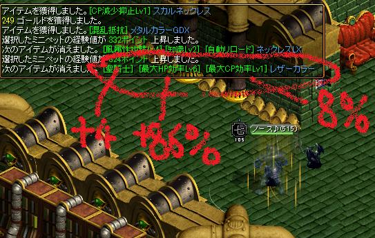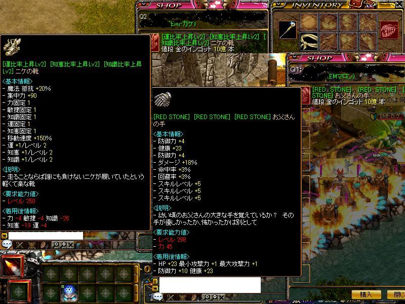 はい!更新さぼってた訳じゃないんだからねっ! ほいほいあった事載せるか~ まずは とりあえず銀行とマップ終わったでござる~ 次は~ SAKURAで鳳凰の翼様と対戦でした~ 集まりは 剣1弓1武道1ネク魔1BIS1WIZ1でしたよ~ 相手の武道様にだいぶ愛されてたみたいで3人くらいに蹴られてましたw こちらの悪魔さんのレクが素敵でした 鳳凰の翼 様ありがとうございました^^ 続いて~アリーナ鯖で遊んできましたよ! リログすれば■消えないのでね! 友に■借りてやってきましたww 素材が良いの無くて適当だけどね! そういえばアレ出来るようになったとです 立ち露店ですね!絨毯乗ってるから座ってるけどorz レベル隠すの忘れたけどもういいやw 今さらだけどなんでレベル隠すんだろう@@ それじゃおまけ行くよ~ GDB1で拾ったとです・・ またの!