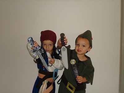 子供たちの学校で毎年この時期AUTUMN FESTIVALが行われます。要はハロウィンパーティで、コスチュームを着て集まりゲームをしたり、オークションをしたりコスチュームの審査?をしたりと。今年は初めて義理パパとママも参加。決して大人が楽しめるものではありませんがま、これも孫孝行という事で・・・とりあえずコスチュームを着て、写真撮影。次男はもちろん長男のお下がりですが長男のコスチュームを探すのが大変でした。本当はディズニーストアーで買いたかったのだけど予定がいっぱいで買いに行けず、パーティー専門店で買いました。ディズニーストアーよりお安く買えましたがそれでも40ドル、その割にはピラピラでもう既に切れてるし~~~(長男、暴れすぎ)これだったら倍だしてもディズニーストアーの方が良かったかしら。次男が着れないジャン。次男はピーターパン。本人はピーマンと言ってます。あ、長男はパイレーツオブカリビアンの・・・誰???映画を見てないので分かりませんがパーティーの前に自宅で写真撮影・・・武器を持たせると必ず戦う兄弟・・・長男、可愛い~~~~女の子みたい・・・グランマと一緒に