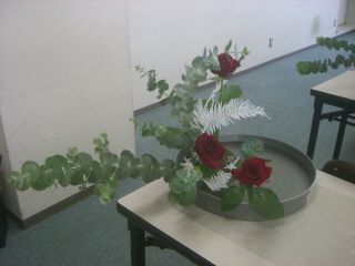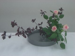 水曜日にお稽古をすっぽかしてしまったので、金曜日に代稽古をつけていただきました。来週は花展のいけ込みがあって(あくまで先生が、です)、お稽古がお休みだったのでほんと助かりました。今日のお稽古は観水形です。どうしても練習量が少ない観水形は、まだまだ自分の中でイメージがわかない花型ですから、少しでもお稽古が増えるのはありがたかったです^^今回学んだのは、七宝の置き方。客枝(1番右側のバラ)は右に30度ふるのですが、七宝は自分に対して垂直に置かなくてはいけないそうです。どうしても右にふろうとすると、七宝もふった方が差しやすいのですがそれではいけないとのことでした。ちゃんと角度をつけないと、後ろの副枝(1番右側に見える紅すもも)とかぶってしまうので、それが注意ですね。ちゃんと役枝を決まった場所に配置?しないと、中間高のバラや紅すももがうまく入りません。そのあたりで今日もイマイチの出来だったのを、先生になおしていただきました。文字通り水を観るように、水盤の水の部分をあけるのも大事なポイントですよね。紅すもものえんじ色の葉色に薄いピンクのバラがキレイな取り合わせでした応援よろしくお願いしまーす
