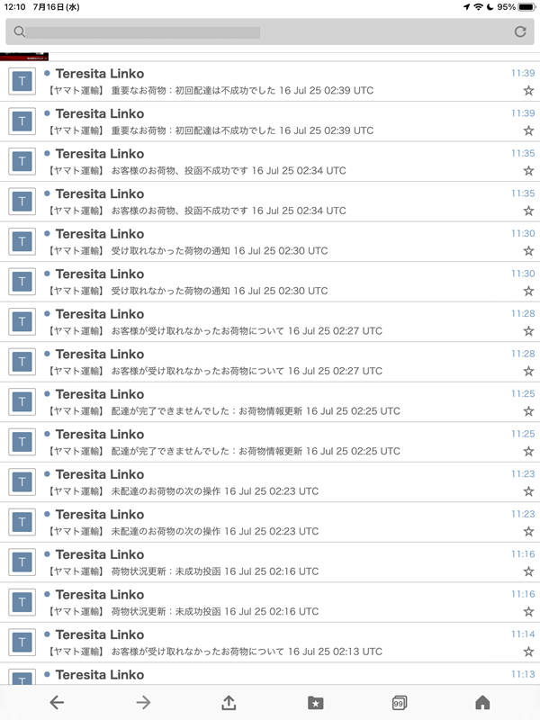 毎日ものすご~い件数の迷惑メールが来る。今日は特にヤマト運輸と名乗ったメールが多かった。その一部を撮影してみた。実際はもっと延々と送信されてきている。そもそも「Teresita Linko」って何よ?人名?企業名?「初回配達は不成功でした」だとか「投函不成功」とか「未成功投函」なんて日本人は使わないよ。どうせ中国からの一括送信メールだろ。しかも右端の送信時間は2~3分おき。あ、ここで件名の時間を見たら02時39分だ。日本と9時間の時差がある所からの発信だ。ごめん、中国。疑ってしまって。大体こういうのは中国が多いもんだからまたテメエの国か、と決めつけてしまった。いつもやってると狼少年みたいに疑われるからね。メールを開けて内容の誤字とかをツッコミたいけどまあ面倒なんで迷惑フォルダをそのまま全て削除。どうせならクスッと笑えるような件名にしてくれよな。