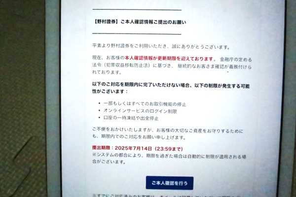 野村證券から「ご本人確認情報ご提出のお願い」メールが来た。迷惑メールフォルダではない受信箱に来たのだがそもそも僕は野村證券と取り引きはない。僕のメールアドレスも登録していない。しかし妻は野村證券に資産を預けている。(いくら入ってるかは知らん)メールの文章をよく読むと「提出期限は今日の23時59分まで」だ。それを過ぎると口座の凍結や出金停止になるようだ。しかしいきなり初めて来たメールなのに期限が今日中なんて変だ。送信先のアドレスもおかしい。こりゃ詐欺メール確定ですな。みなさんも気をつけて。