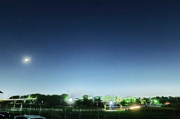 今日の夕方は雲一つない快晴になった。18時に仕事が終われば帰り道に急いで田んぼ道に行ってレモン彗星の撮影に再挑戦しようと思って意気込んでたら「19時半まで残業します」と無線が流れた。あ~あ、せっかくの快晴なのに写真撮れずに仕事かあ。待てよ、帰り道に田んぼ道で撮る、という発想が間違いだったのだ。仕事場で撮ればいいではないか。僕しか運転しないトラックで誰もいない場所に行けばいい。たまには仕事を抜け出してもバチは当たるまい。巡回してるフリをすればいいのだ。(会社の声:あなた毎日巡回してるフリをしてるだけですね。 バチが当たるどころか給料カットもしくは首カットね!)というわけで18時半を過ぎた頃、トラックに乗って出動。目的地は西の空が見える敷地の隅っこだ。【去年の10月14日にアトラス彗星を撮影した場所と同じ】その時と同じようにトラックの荷台に上がって屋根の上に簡易三脚をセットして撮影。会社の上司が来ないことを祈るばかりである。で、撮ったのがこちら。明るいのは三日月ね。な~んにも分からんじゃんか...。やはり薄明と街の明かりがひど過ぎる。残念、月もだんだん太って明るくなっていくしもう撮れないだろうな...。