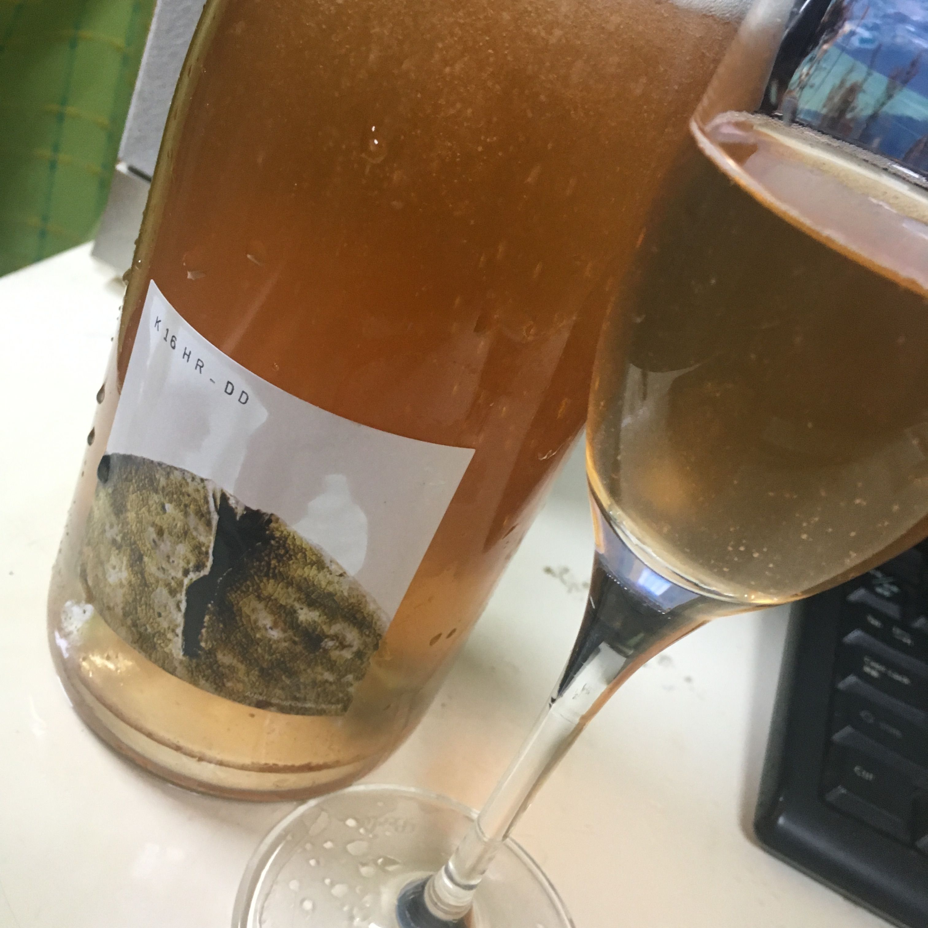 以前も飲んだ共栄堂さんの別ワイン。K16HR-DDというやつです。甲州種100%で発泡性、橙色のワインです。濁りを伴った山吹色。フジりんごを中心にマンダリンのような青さも感じられます。グアバやパイナップルのような南の果実様もあり、スミレやアカシアのような花の香りも感じられます。ヨーグルト様の爽やかなミルク感とやや湿ったトースト感。淡くオーク系のナッツやスパイス感も、若干のなめし皮も見えます。やや大きめの炭酸と舌に感じる酵母の粒子。トーストを中心に香辛料やナッツの味わいの方が強く感じます。柑橘よりも鼻に抜ける香りは花系の香りです。抜栓直後の泡には要注意です。ゆっくりと、ガスを抜くように少しづつ開けてください。ボウルで受けたり、シンク内で注意して開けてください。大きめの泡は長く続きます。亜硫酸無添加。と、某サイトで書かれておりました。確かに炭酸ガスがけっこう出るので開けるのに苦労します。そして酵母由来と思われるトーストっぽさというニュアンスを感じます。ここらへんは四恩さんのときと同じ流れですね。うまうまー。