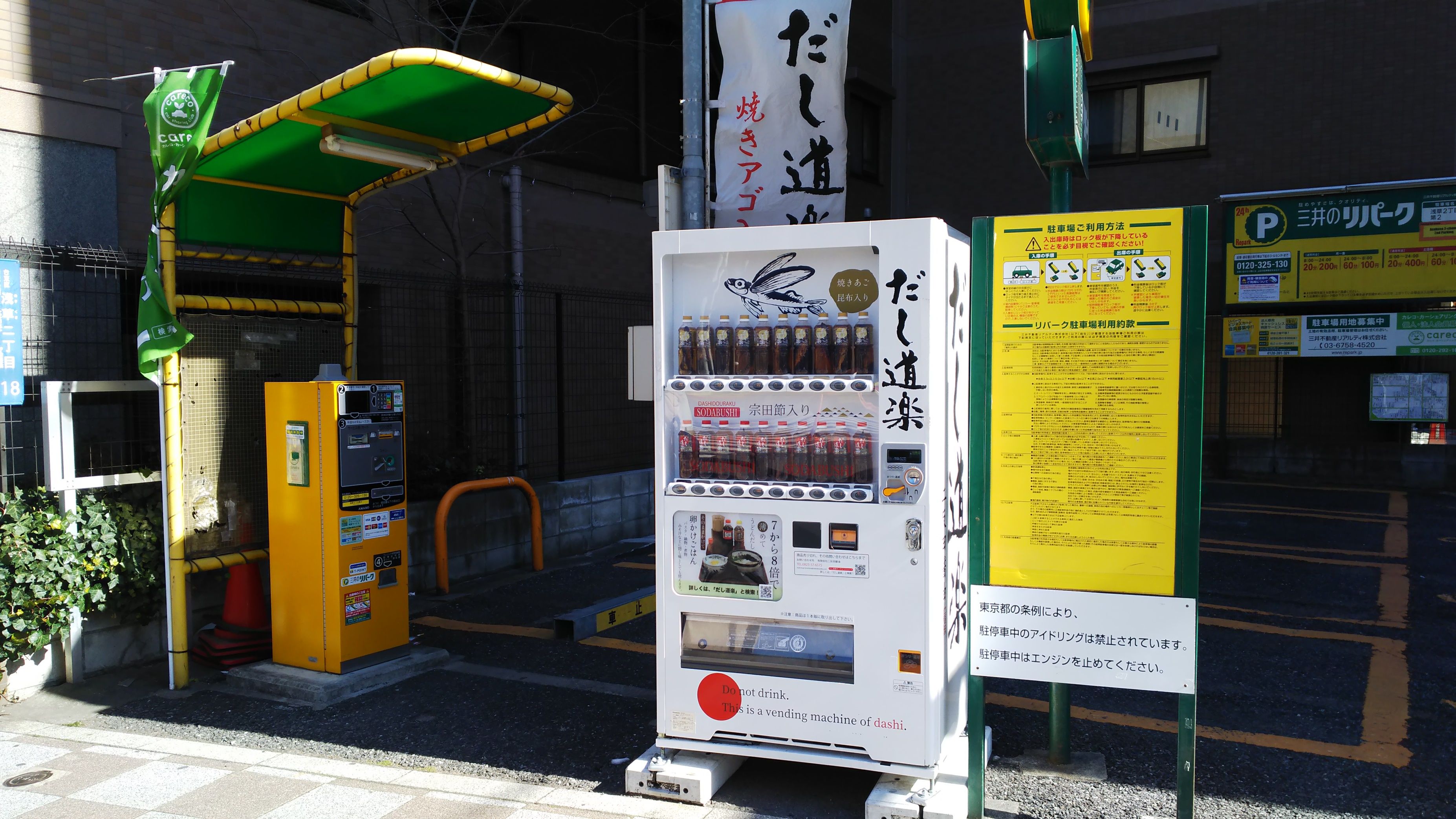 とある日、浅草の浅草寺の裏手を歩いていたらへんなもんを見かけた。それがこちら「だし道楽」の自販機です。タイムズ的な駐車場にいきなりあってびっくりしていたのですが、この自動販売機を見ていたら地元の方と思われるおばさんが声をかけてきて「おいしいのよー」って言って買っていかれました。なんか面白かったので私も1本買ってみました。ちなみに「だし道楽」は二反田醤油醤油さんという江田島にある会社さんが出している自動販売機で北海道から福岡まであるようですね。たしか500mlで700円だったかな?買ったのはあご出汁でしたけど焼きアゴが入ってますw正直まだ使ってませんけどおいしそー。