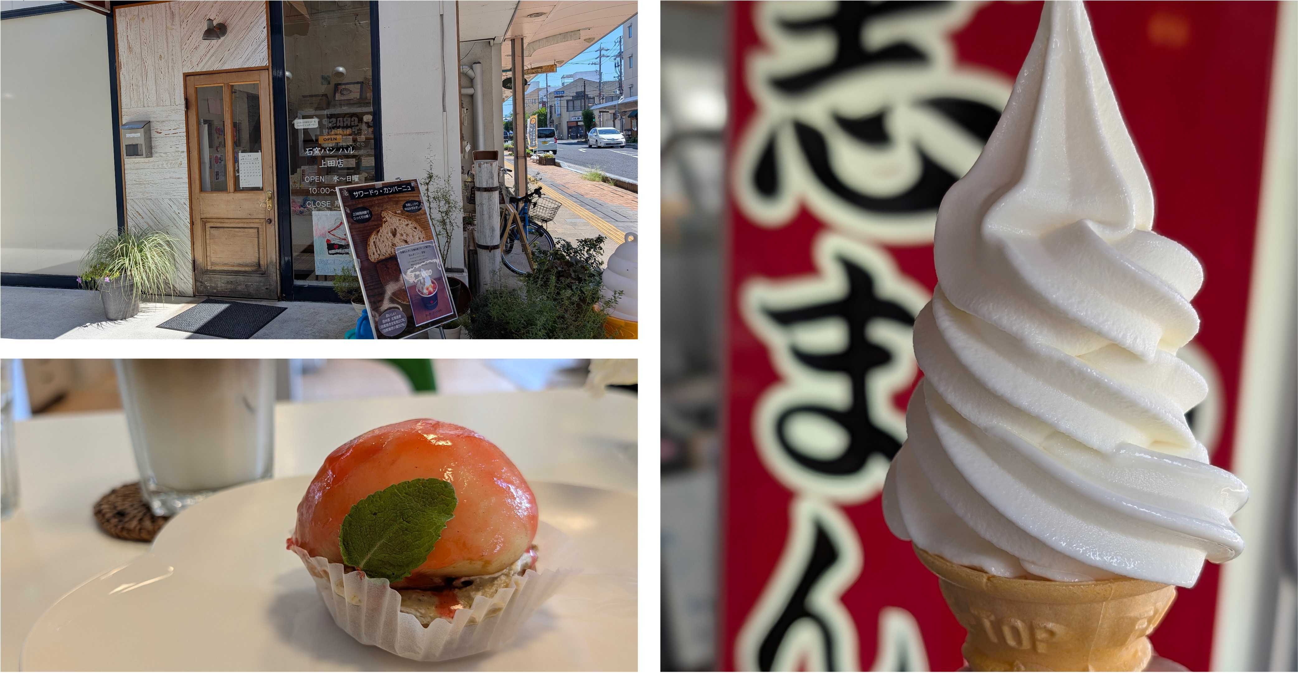 とある日、上田市内をうろうろしていたあきらっく。本当は17時くらいまで上田市にいて、焼き鳥を食べたかったのですけど、炎天下で体がもたないので15時くらいまでしかいれませんでした。お店に入って涼もうとしたってそんなに長いこといれないし、食べ物も飲み物もこれ以上いらんって思っちゃうのでしょうがない。まずは映画を観る前に食べたのがソフトクリーム。『富士アイス 上田店』さんで、じまん焼きを購入しつつ、ソフトクリームもいただきました。じまん焼きは今川焼きなんですけど上田市のソウルフードらしいです。あずきとクリームがあって普通よりも分厚いかな?うまうま。そういや、こちらのお店で持ち帰りで買うと、外装は新聞紙で包んでくれます。その新聞紙ってどうやって手に入れているんだろう。結構な枚数だと思うのですけど。その後、すぐ近くにある『石窯パン ハル』さんにいきました。パン好きだから。こちらのお店は長野県産・北海道産小麦、自家培養発酵種(サワードゥ)、富士山溶岩窯、植物性素材100%。昔ながらの製法を大切に、滋味深く風味豊かなパンを焼いています。なので、持って帰る用に購入したんですけど車じゃないのでスペースとって苦労したわ。上田城見学の帰りに立ち寄った『クローバークローバー』さん。ケーキ屋さんですけどイートインができるのでこちらの川中島ピーチパイとカフェラテで一休み。桃がうまうまー。ハーフサイズの桃が丸っと乗ってます。ちなみに丸っと1個あるっぽいのは川中島ピーチタルトになるっす。桃は散々食べたんだけどうまうまです。って感じであんかけ焼きそばも絡めたらいっぱい食べたなぁ。まだ食うんだけど-------------#狂躁的非日常と日常#あきらっく#ささだあきら#長野県#上田市#富士アイス 上田店#じまん焼き#ソフトクリーム#石窯パン ハル#クローバークローバー#川中島ピーチパイ-------------