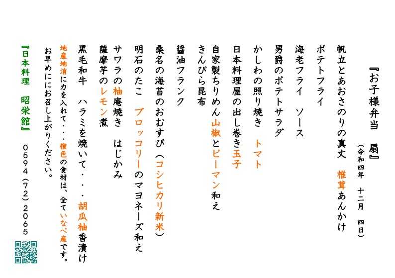 「お子様弁当 扇 豪華版 3,240円」のお献立です。