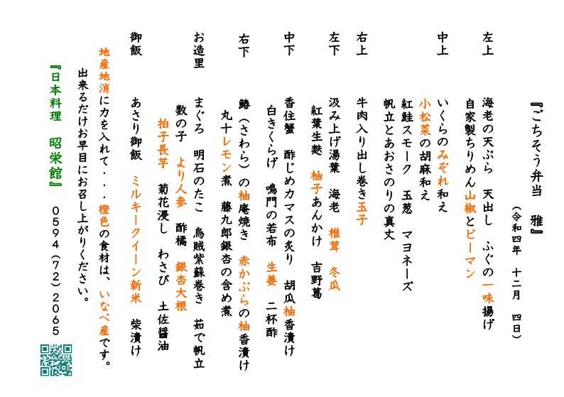 「ごちそう弁当 雅 5,400円」のお献立です。