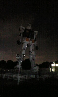 日曜日に、お台場に出掛けて来ました。用事は 1.担々麺を食べること 2.友達の出産祝いを買うこと 3.お台場に出現したガンダムを観に行くこと1と2は、お台場でなくても良かったのですが、3だけはどうしてもお台場でなくてはいけません。とはいえ我が家はお台場から2駅。近場で済ませただけなんですが(笑)坦々麺は、暑い夏に辛くて美味しいものが食べたいと思ったら、頭に浮かんできて、数日前からどうしても食べたかったのです。それも、ラーメン屋のではなく、中華料理屋の上品で本格的なものが食べたかった。出産祝いは、子供服でも買おうかな~と思っていました。担々麺美味しかったです。アクアティにある中華料理店で食べましたが、まさに求めていた上品な辛さ!ビールに餃子も食べて、大満足です。子供服はコムサで買いました。セール中で半額、ラッキーでした(笑)そしてガンダム。予想はしていましたが、かなりデカイ!等身大にはたまげました。海辺の公園にそびえ立っている姿は、不思議な違和感があり、それを取り囲む大勢の観客と重なって、お祭り気分が掻き立てられ、ガンダムを全く知らない私でも、楽しい気分になることが出来ました。夜9時をまわっていたせいか、残念ながらライトアップは終わってしまっていて、真っ暗の中、携帯で写真を撮ってみました。大勢の観客がカメラで撮影していたので、そのフラッシュが光る瞬間を狙って何度もチャレンジし、やっと取れた一枚をアップしますね(^^)