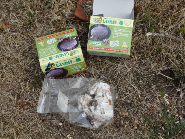 こんにちは^^随分とご無沙汰してました^^ブログアップしようと思えば時間があるにはあったんですが・( ^ω^)・・・この間次男君と長男君は春休みに入ってしまって毎日家にいます^^お陰で奥さん二人の昼食を作るのが大変です( ;∀;)長男君はラーメンが好きなので毎日でも良いようです^^生協の冷凍ラーメンが具も入っていて長男君大好きのようです^^次男君がラーメンは余り好きでなく又うるさくて同じ麺でも焼きそばが良いようです^^先日は近くの「はま寿司」へ連れて行きました^^長男君の食欲旺盛には( ^ω^)・・・20貫ほど食べてました(^_-)-☆先日今年もシイタケ菌を打ちこみました^^これで三年連続です^^シイタケ菌にも色々種類があり今回は「にくまる」結構肉厚です^^この白っぽいのが菌です電気ドリルで原木に穴を開けますシイタケ菌をハンマーでたたいて打ち込みますシイタケ菌を打ちこんだ原木を「ホダ木」と言います下に木を置いて横にします上にダンボールを被せて更にブルーシートをかけて風で飛ばされないように隅々へ重しを置きます。はい^^これで終了です^^これで梅雨が明けた頃までこのままにしてシイタケ菌がホダ木にいきわたるようにします。梅雨が明けた頃に上下四方を遮光ネットで覆ったホダ木置き場へ移動させます^^このホダ木からは夏を2回越した頃の秋ごろにシイタケが出てくるはずです^^これは2年前のホダ木です、昨日の写真です出てますね^^採れたてをバター醤油で焼くと超美味です(^_-)-☆