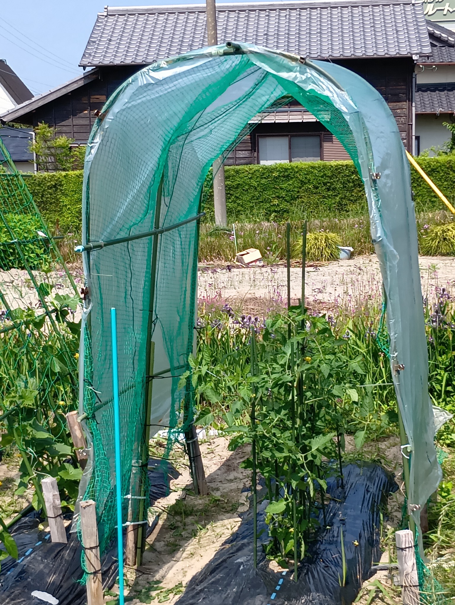 こんにちは^^昨日に続きブログが更新できました^^今日も孫三人元気に登校・登園してくれてます^^自分の1週間の予定ですが^^一応原則、作業は午前中で午後から身体を休める時間帯と決めてます^^特にこれから暑い夏に向かって必要不可欠な時間帯と思ってます^^月曜日は予定なし(急に予定が入る事があります)火曜日:11時半からと15時半からの高齢者向けのお弁当配達業務水曜日:15時半分から社会福祉協議会から依頼されてる高齢者宅の生ゴミ出し(ふれあいサポーター)木曜日:11時半からと15時半からの高齢者向けのお弁当配達業務金曜日:電気マッサージ、月一回の民生委員児童委員協議会定例会土曜日日曜日:孫のお世話2ヶ月1回の血液検査の為の受診2ヶ月1回の耳鼻咽喉科受診3ヶ月1回の眼科受診(来年3月白内障の手術予定)3ヶ月1回の内科受診(糖尿病予防検査)不定期にシルバー人材センターの依頼仕事この日や以外の日の空いた時間を利用しての家庭菜園の農作業及び民生委員の業務の一人暮らしの高齢者等のお宅訪問(近況伺い・安否確認)これが年間100日余りです^^民生委員児童委員の業務ってこれ以外に急に入る業務も結構あります。民生委員児童委員は今年11月一杯で1期3年の任期が終了します今年は全国一斉改選の年です。自分はもう1期3年継続するつもりです^^これで合計3期9年となります^^で、今日はお昼のお弁当配達まで時間が空いたので🍅の雨除けビニールシートを掛けることが出来ました。で、もう一つ小玉🍉の支柱に網掛けも出来ました^^これで完成ではなく所々網を支柱に括り付けます明日でもやりましょうか??明日は今のところ15時30分から社会福祉協議会から依頼されてる高齢者宅の生ゴミ出し(ふれあいサポーター)しか予定が無いので大玉🍉の親蔓の剪定🥒の余分な枝の剪定🍅の支柱前後のビニール掛け夏野菜等の風よけビニールシートを外して苗の支柱への括り付けでもしましょうか??
