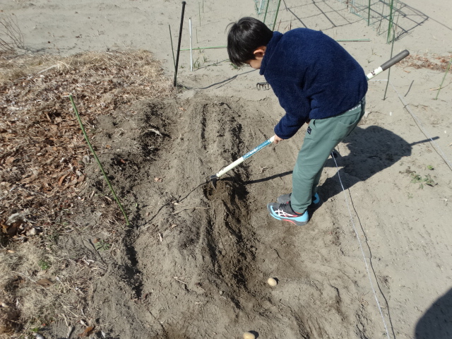 こんにちは^^随分とご無沙汰してました^^2週間以上でしょうか??先週は暖かい自分の住んでる地域にも大寒波が襲来??朝方の最高気温が7℃最低気温が4℃中々布団から出る事が出来なかったです( ;∀;)3連休だった為孫たちは休みで起きるのが遅かったので7時まで寝てました(#^.^#)で、先日長男君が学校から帰って来て宿題が終わった頃に急にジィの畑でジャガイモを栽培したいと言い始め、タマタマ秋じゃがが残っていたのでそれを植える事にしました。まぁ畝を作るのは長男君では大変の為畝は作ってやりました^^畝の真ん中に溝を掘って種芋を置いて溝に土を被せて作業は終了です。後は自分が種芋を植える時に一緒にマルチシートを被せます約1ヶ月位で芽が出てくるはずです(#^.^#)